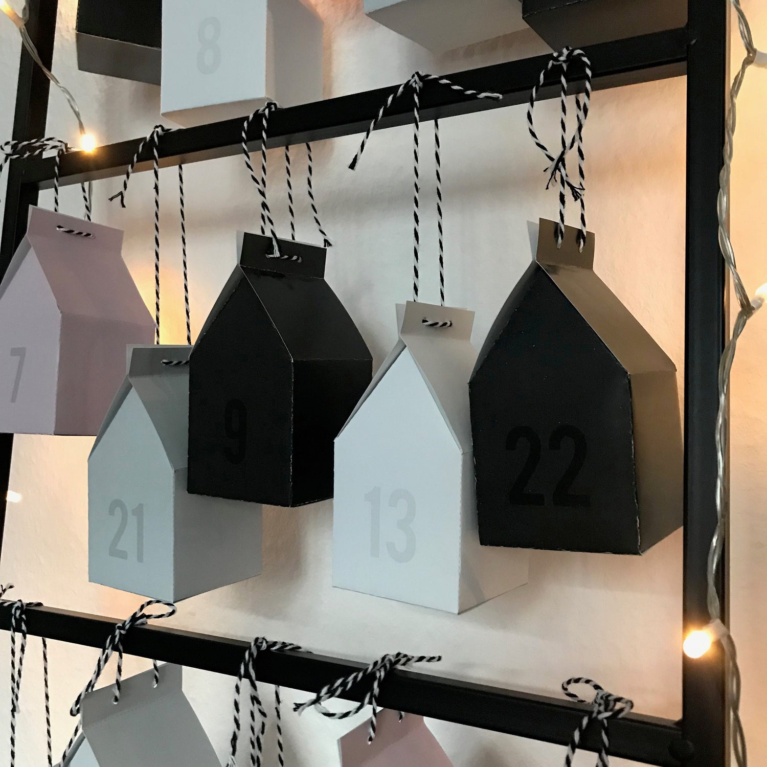 Das Set besteht aus 24 Bastelbögen (Maße A4), auf welchen Häuschen in der Größe 6x6cm aufgezeichnet sind. Alle Häuschen haben die gleiche Form. Neben den 24 Bastelbögen findet ihr zudem 1 Seite zur Anleitung mit im Paket und 1 Seite als "Probehäuschen", so dass ihr einmal üben könnt :) Die Häuschen sind abwechseln in den Farben weiß, rosa, hellgrau, dunkelgrau und schwarz eingefärbt. Jedes Häuschen kann über das Dach geöffnet werden. Man kann das Dach entweder mit einer Wäscheklammer schließen oder alternativ lochen und dann aufhängen. Über das Dach könnt ihr kleine Geschenke und Aufmerksamkeiten einfügen. Der Boden wird fest verklebt.