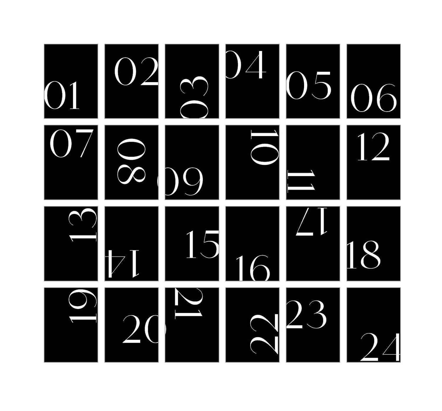 Das Set besteht aus 24 Postkarten mit den Nummern 1-24 im modernen Black&White Stil. Somit sind die Karten auf verschiedene Weise einzusetzen. Die Rückseite ist unbedruckt und bietet dadurch viel Platz für individuelle Worte falls gewünscht.